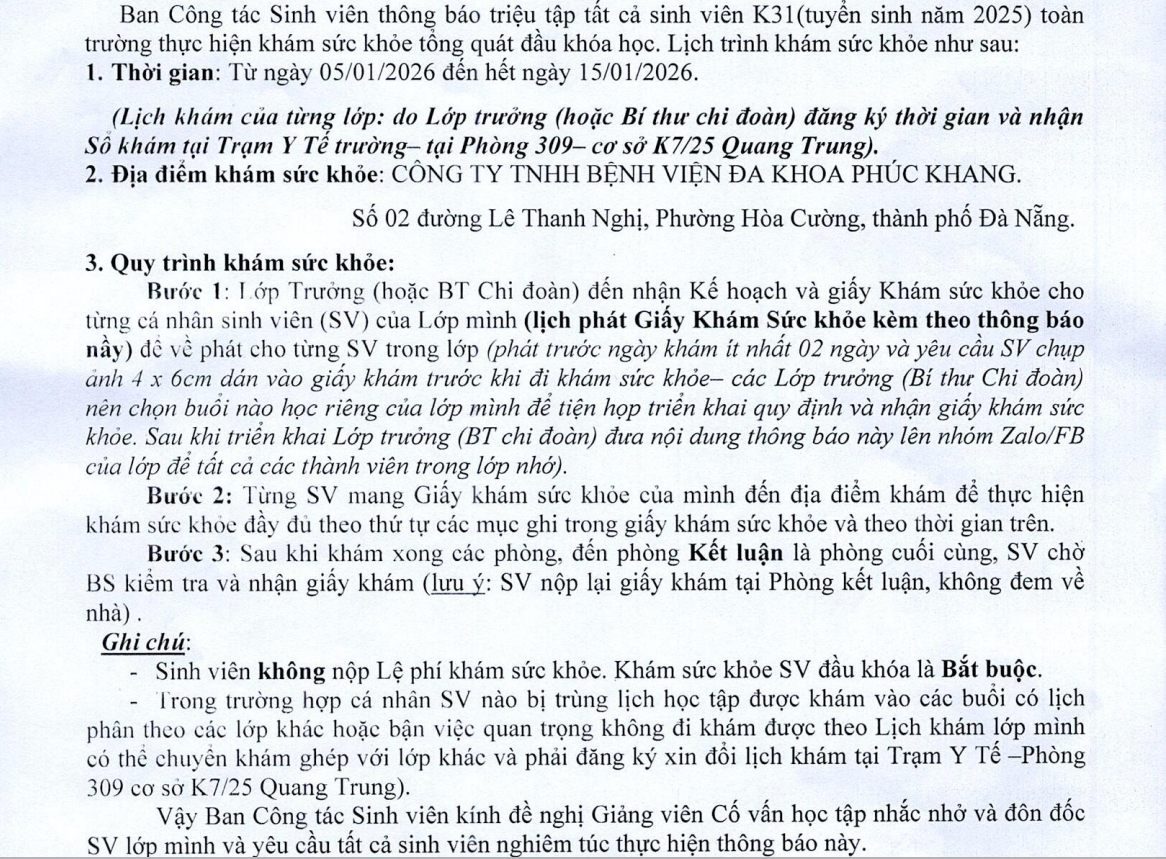 Thông báo khám sức khỏe tổng quát bắt buộc đối với sinh viên K31 (2025)