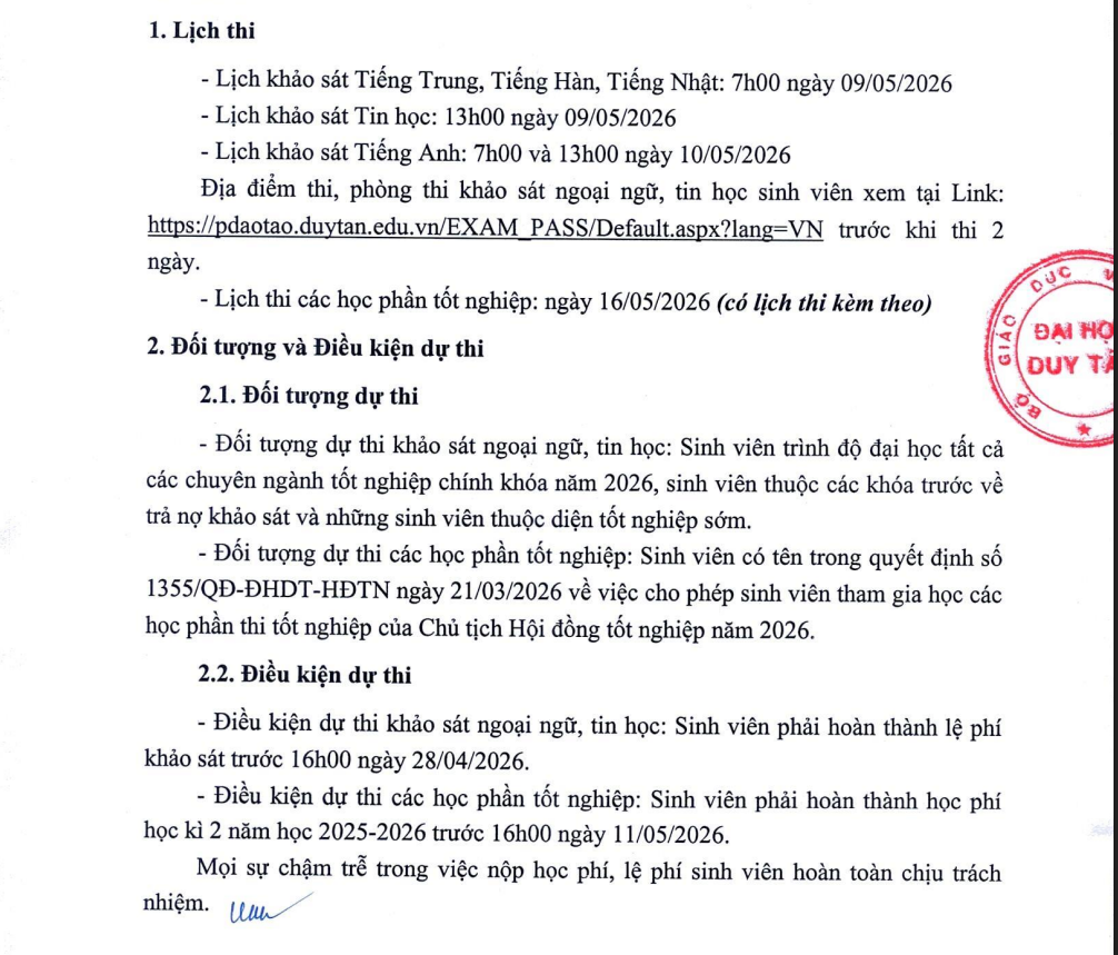 Tổ chức thi các học phần Thi tốt nghiệp và khảo sát ngoại ngữ, tin học đợt tháng 05/2026