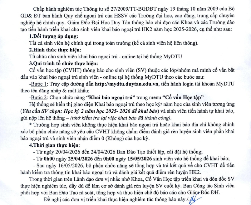 Về việc Tổ chức khai báo ngoại trú sinh viên HK2 năm học 2025-2026