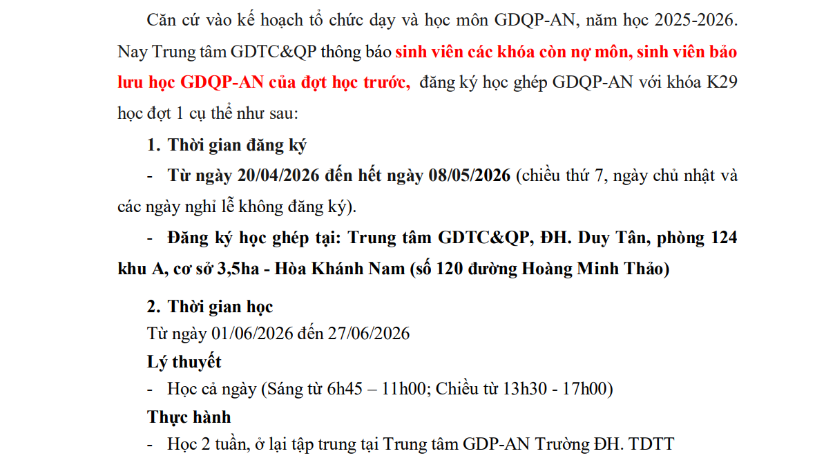 Lịch học GDQP-AN khóa K29 đợt 1 từ ngày 01_06 đến 21_06_2026